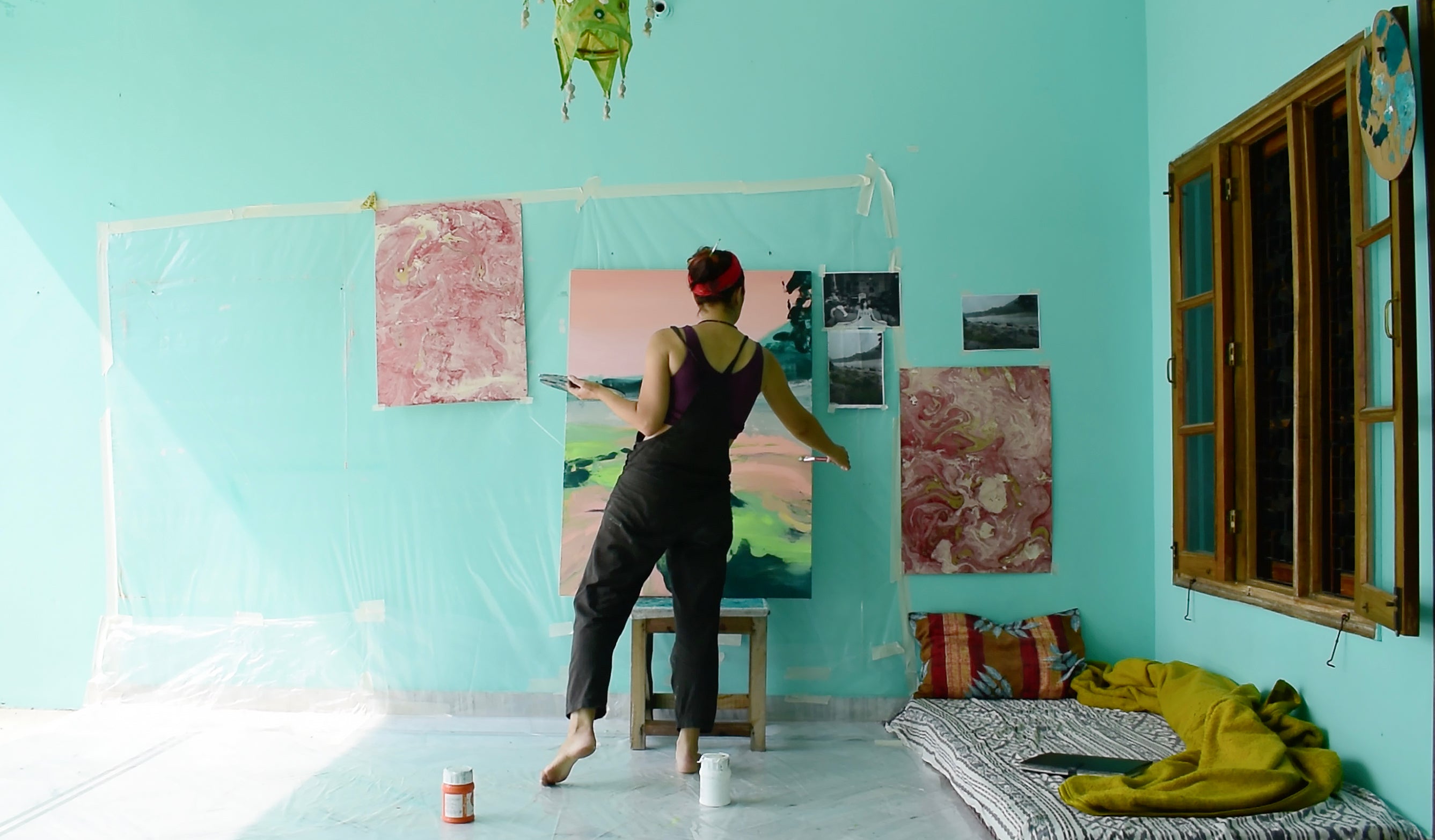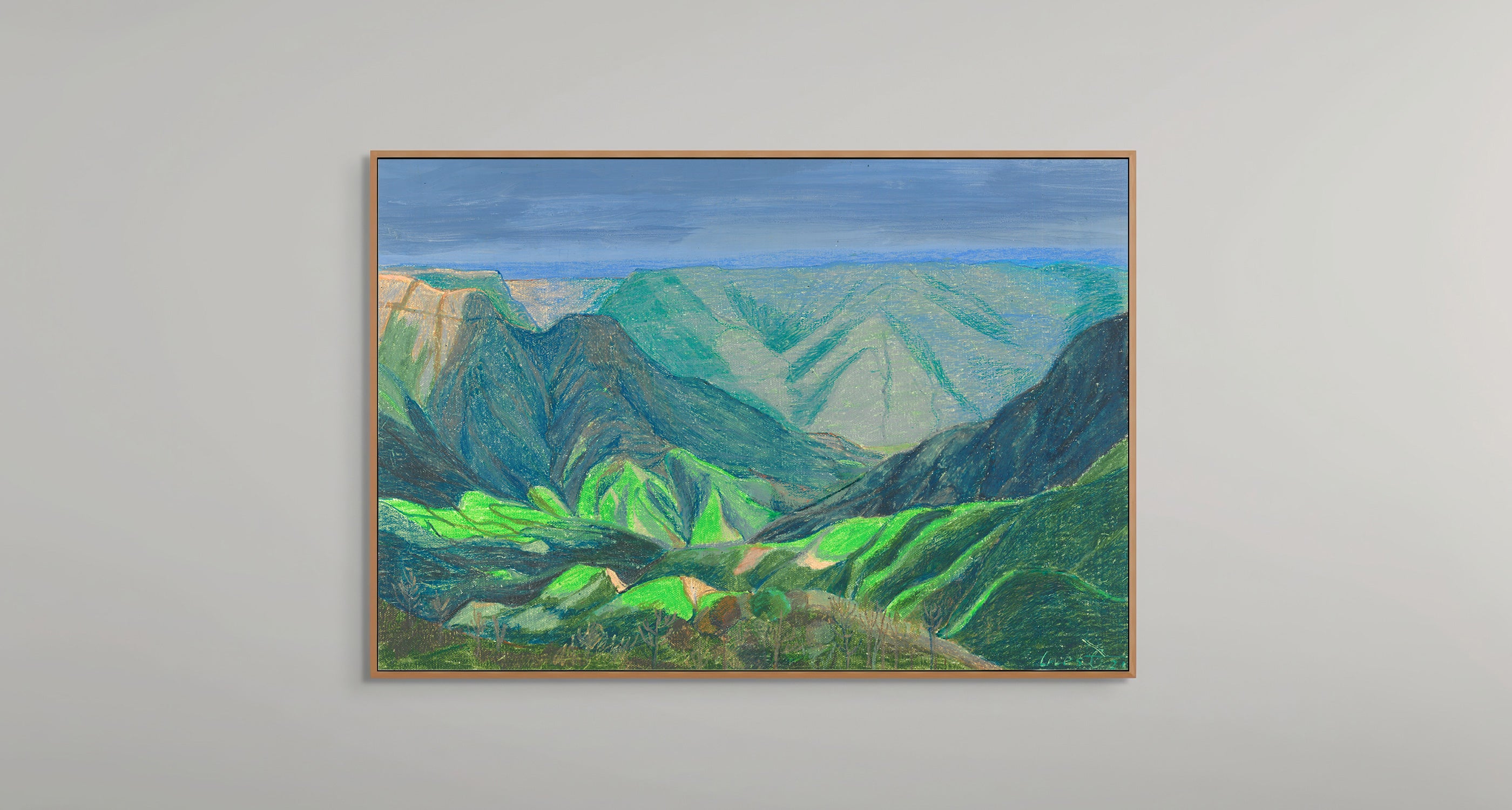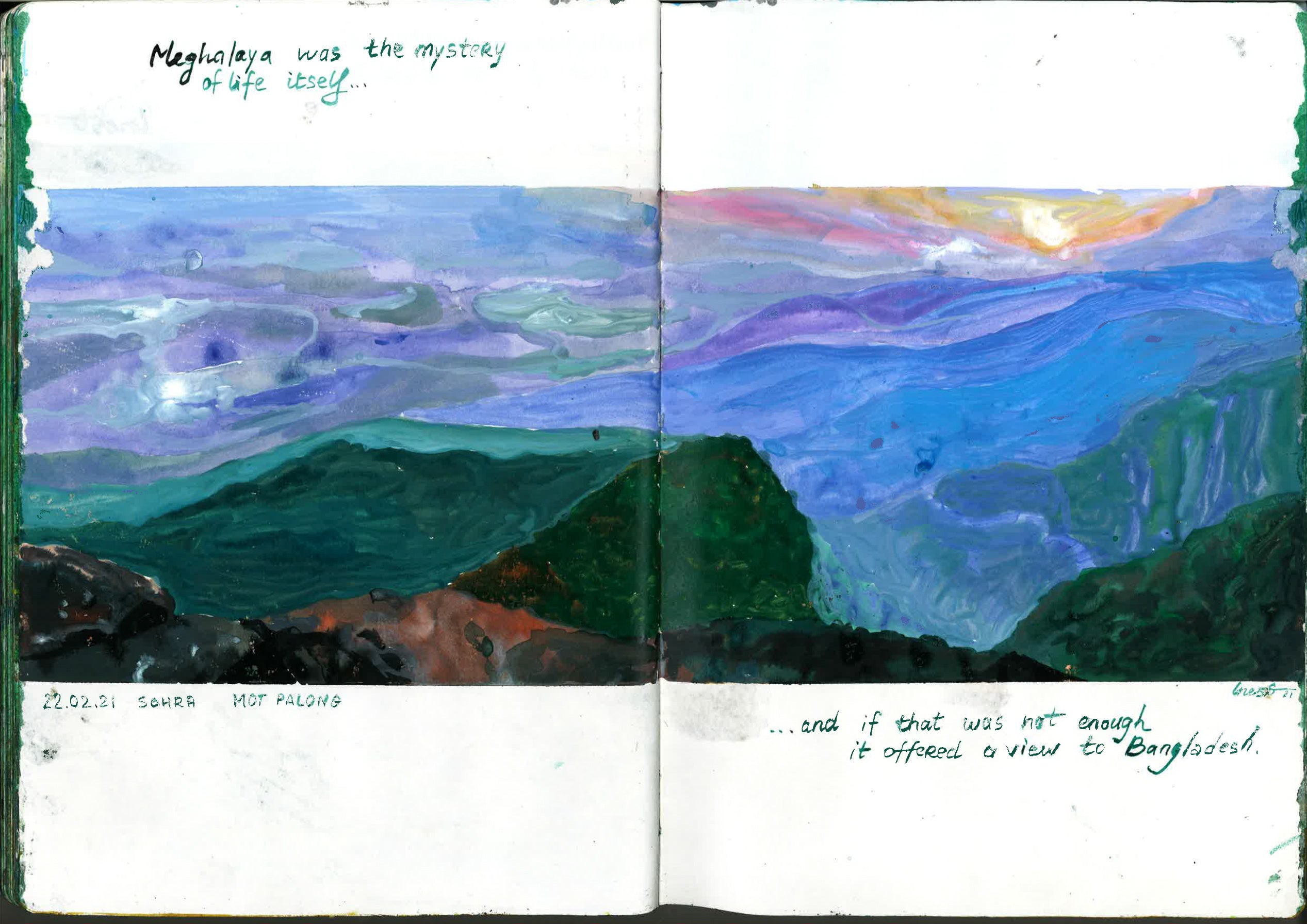 In 2021, I gave up my long-term studio base in India and travelled through Meghalaya, 'Abode of Clouds', in the North-East India on a motorbike. With a travel pad tied to my backpack, I made oil-pastel landscape studies where the road and local tribes would take me.