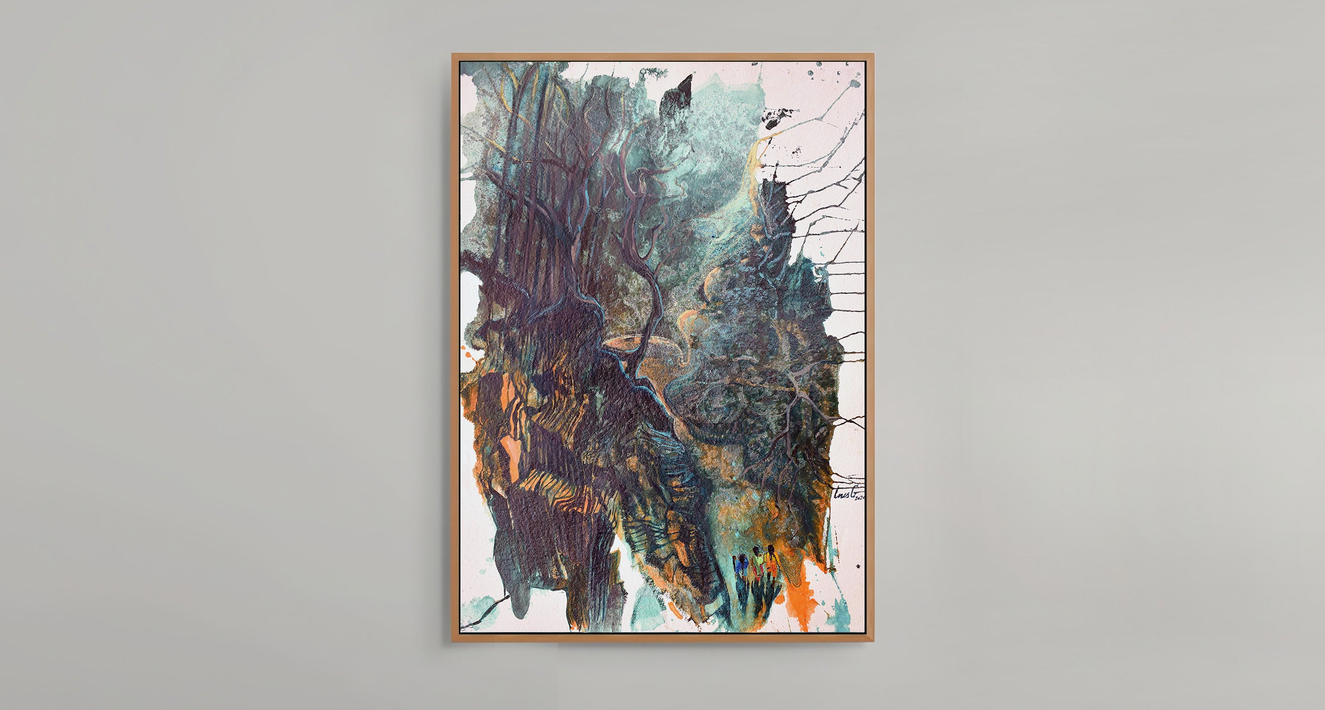 This work emerged from twilight walks along jungle roads, where fleeting encounters with Indian women in vivid sarees became part of the surrounding landscape. The image was developed through a monoprint process and later worked into by hand with oils.