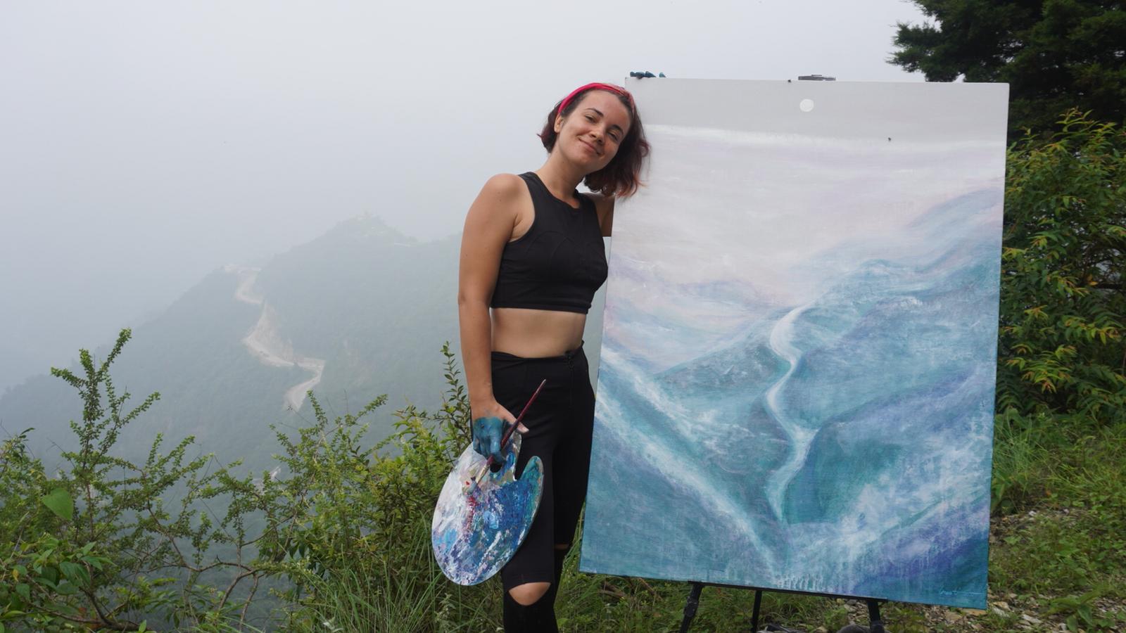 The painting was created during the monsoon season in the foothills of the Himalayas. The artist traveled through thick fog to the top of a hill near the Kunjapuri Temple, which sits at 1,676 meters. The scene captured combines sunlight and fog, reflecting the strange beauty of that day, where the view felt infinite and peaceful, despite the misty surroundings.